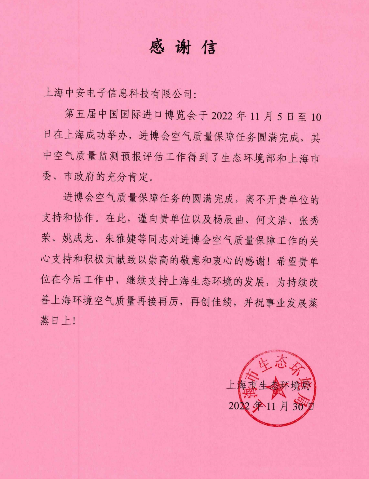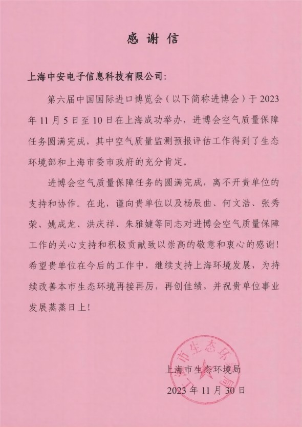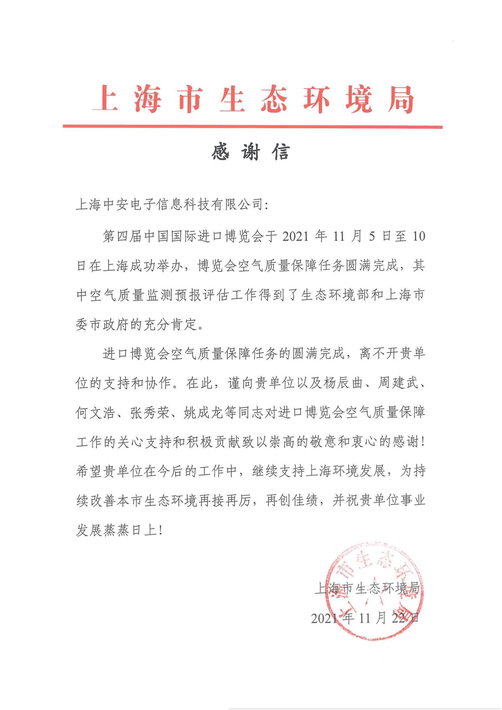 上海環(huán)監(jiān)中心就中安科技在21年國際進(jìn)博會(huì)空氣質(zhì)量監(jiān)測預(yù)報(bào)工作中杰出貢獻(xiàn)送來感謝信!(2021/12/31)